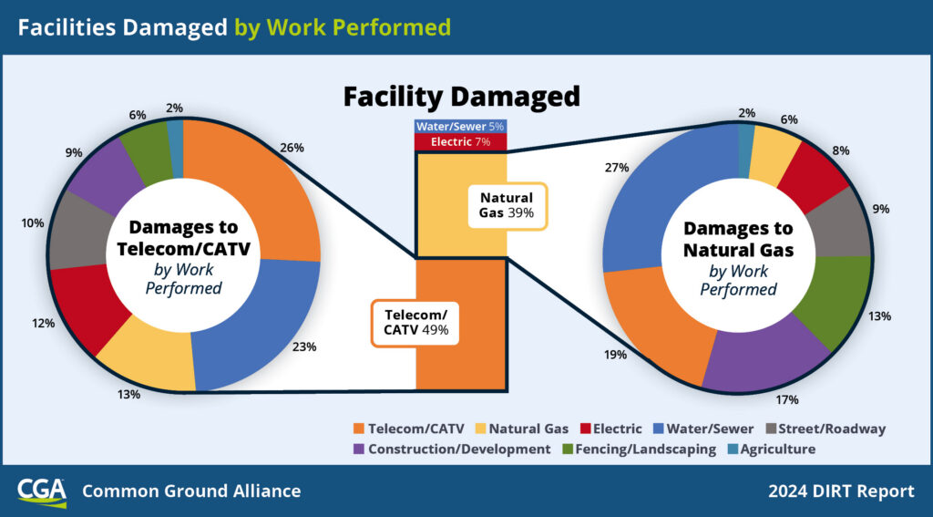 - The DIRT report also highlights that when telecom is performing telecom work, telecom facilities are damaged the most. When natural gas facilities are damaged, telecom work is the second most prevalent type of work causing damages (see chart below).
